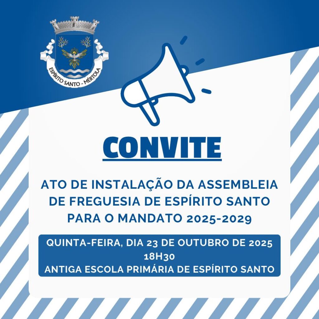 O Ato de Instalaรงรฃo da Assembleia de Freguesia de Espรญrito Santo para o mandato 2025-2029 irรก realizar-se na prรณxima quinta-feira, dia 23 de outubro de 2025, pelas 18h30, nas instalaรงรตes da Antiga Escola Primรกria de Espรญrito Santo.